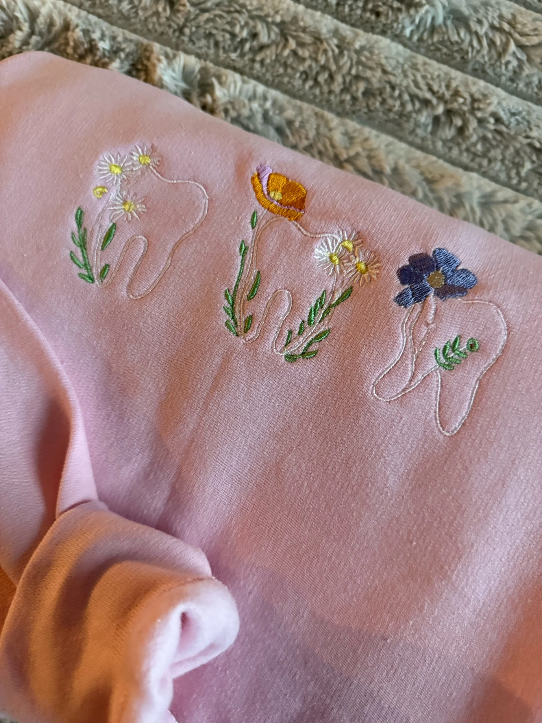 Image 1 of 3 Image 2 of 3 Image 3 of 3 Floral Teeth $40.00 Size: Select Size Small Medium Large XL XXL XXXL Color: Select Color Pink Blue Purple Tan Black Gray Quantity: Add To Cart Added!